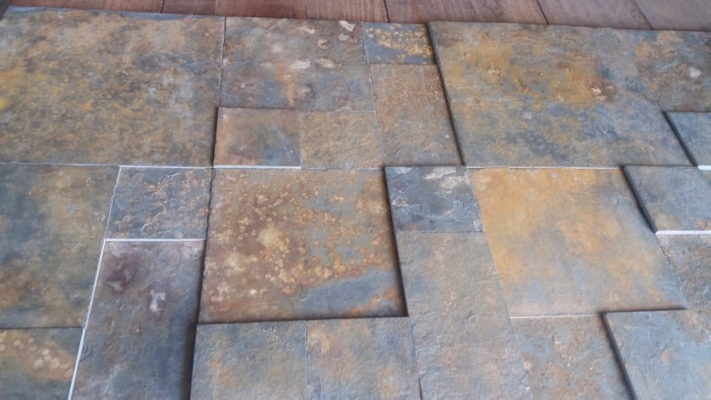 / Mosaico PNAF 123 - Pedra Ardósia Ferrugem (peça60x60cm)PEDRA ARDOSIA FERRUGEM , CORTADA EM PEÇAS DE 20X20, 20X10, 30X30 E 10X10 CM, COM VARIAÇÃO DE ESPESSURA. MOSAICO FORMADO POR 4 PEÇAS DE 30 X 30cm, CONFERINDO DIVERSAS SOLUÇÕES. USO INDICADO: PAREDE INTERNA E EXTERNA. ESPESSURA: VARIÁVEL. Pedras naturais podem ocorrer pequenas variação de tonalidade de acordo com o lote de fabricação.